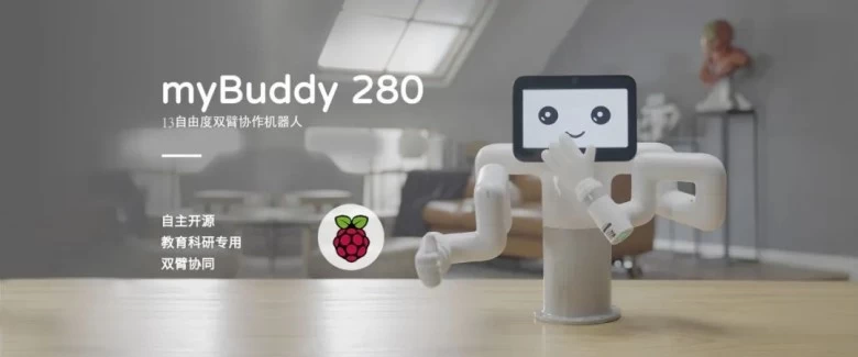 myBuddy 280双臂协作机器人是大象机器人与树莓派联名产品,属于双六轴类人体构型协作机器人,自带7寸可交互式显示屏幕,内置20+动态表情可直接应用,提供双200W像素高清相机,可以进行图像视觉开发,提供标准的3.3V扩展io接口,提供乐高扩展接口,可以安装吸泵、夹爪等多种适配器,提供机器视觉学习相关教学文档,可以直接上手进行产品二次开发。