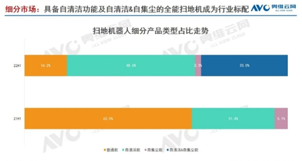 近日,奥维云网发布中国扫地机器人市场半年总结。2022年上半年,整体家电市场略显低迷,但是消费者对清洁电器需求不减,扫地机器人线上零售额为57.3亿元,同比增长9%。产品方面,自清洁款产品占比最高,达到了48.6%,带拖地功能、且机器能自己洗拖布已经成为当下消费者购买首选。品牌方面,科沃斯、石头科技、云鲸智能稳居第一梯队,三者占据近80%的线上零售份额。