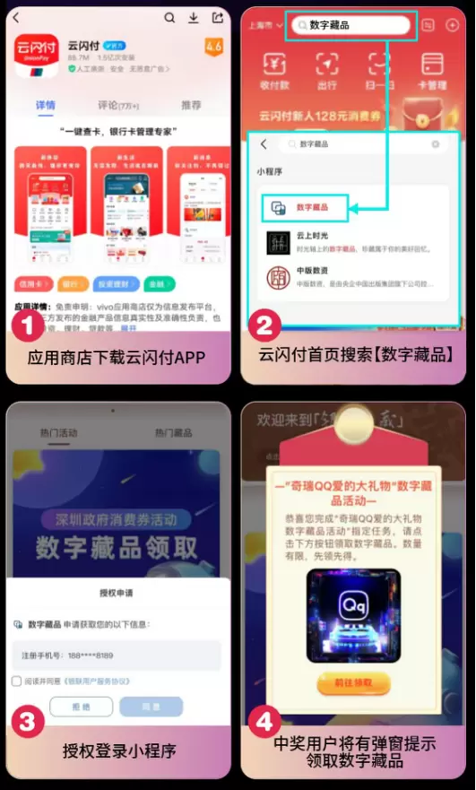 中奖用户使用中奖页面登记的手机号码,登录云闪付APP“数字藏品”小程序,弹窗提示“奇瑞QQ爱的大礼物”数字藏品活动,点击进入活动页面,即可完成领取。