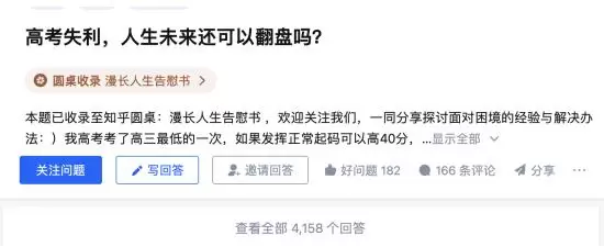 高考失利后你是如何释怀的?那些高考失利的人现在怎么样了?知乎上有大量高考失利的问答,涉及教育、生活、心理、情绪等话题。“高考失利,人生未来还可以翻盘吗?”问题下,知乎答主祉久的回答收到4364个赞同,引发大量用户的共鸣。高考失利后的祉久并没有选择复读,而是在大学通过不懈努力拿到奖学金,并通过商法考试和雅思,她在回答中写道,“每个人都会有自己的路,都会有发光发亮的时候。天道酬勤,你想成功,你就要去做”。
