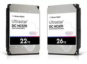 <西部数据22TB Ultrastar DC HC570 HDD (左)和西部数据26TB Ultrastar DC HC670 UltraSMR HDD (右) >