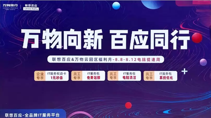 在8月份,联想百应和万物云携手举办了“万物向新、百应同行”园区福利月活动,通过“电脑提速周”、“设备升级周”和数字化转型分享沙龙,让园区的中小企业群体找到数字化转型的方向和方法。