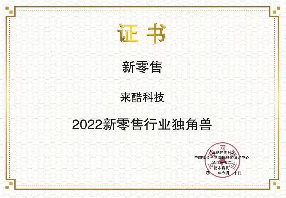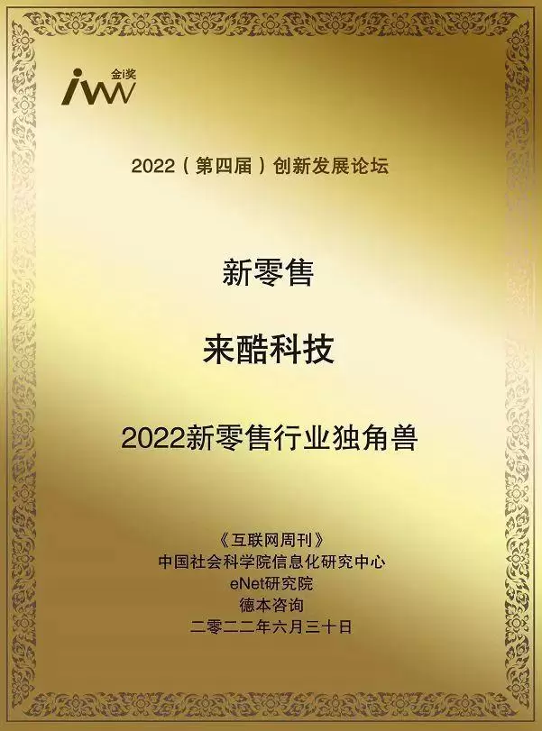 近日,中国科学院《互联网周刊》、中国社会科学院信息化研究中心、eNet研究院、德本咨询作为主办单位,于2022年6月举办了“2022(第四届)创新发展论坛”,来酷科技斩获2022年新零售行业独角兽。