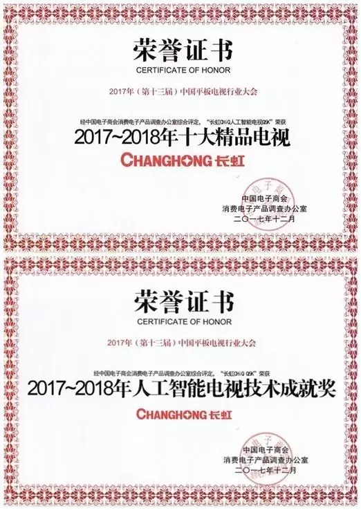 在12月18日举行的第十三届中国数字电视产业发展大会上,长虹CHiQ人工智能电视Q5K,凭借突出的远场语音、声纹识别、语义理解、模糊搜片等创新人工智能应,获得现场颁发的“2017-2018年十大精品电视”和“人工智能电视技术成就”两项大奖。
