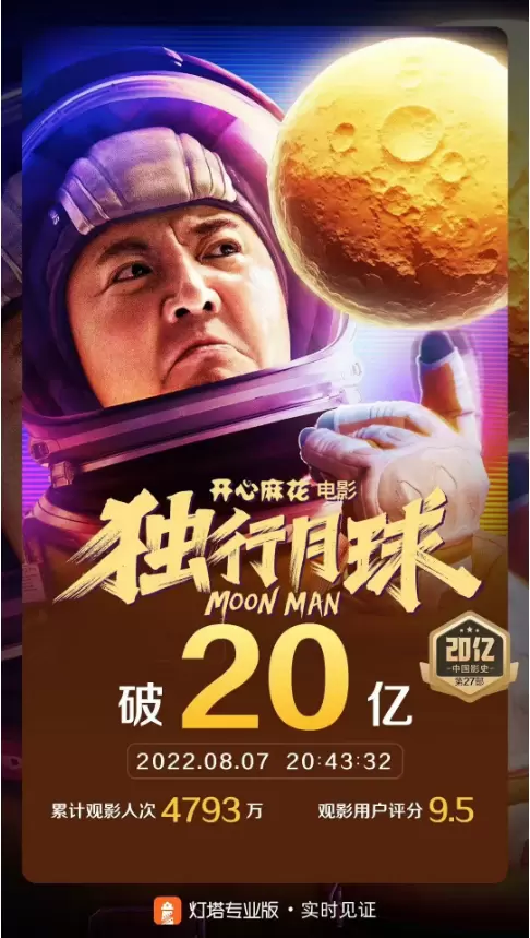 原本沉寂已久的电影市场,被《独行月球》这部电影给彻底引爆。据灯塔专业版数据显示,截至8月7日20时43分,《独行月球》票房突破20亿元。按照目前的日均票房表现,《独行月球》票房达到预计的40亿元只是时间问题。