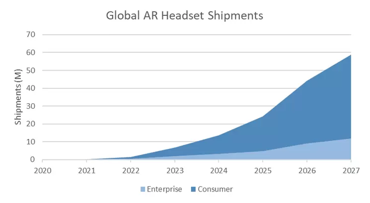 Strategy Analytics报告指出, 2027年全球专用AR头戴设备市场的出货量将接近6000万部。但至今为止,AR终端市场仍由企业级设备主导,如微软的HoloLens。尽管产品价值相对较高,但交易量仍然较小。只有当消费市场起飞时,AR头戴设备市场才能全面发挥其潜力。
