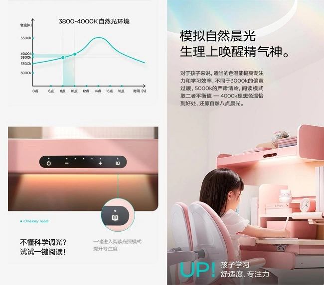 色温是影响孩子学习状态的一项因素,家长平常更关注光照大小,并不很重视色温的作用。色温过低,偏向暖色调,使人过于松散安逸,适合休息安睡;色温过高,偏向冷色调,让人精神紧绷,长期处于刺激状态。S2感光护眼系列采用4000k色温的集成护眼灯,色温柔和但并不过度,还原上午8点的自然光。并且护眼灯能根据周围环境自动调节亮度,随时随地调节至最合适的灯光亮度,给孩子打造最舒适、最适宜学习的光照环境。
