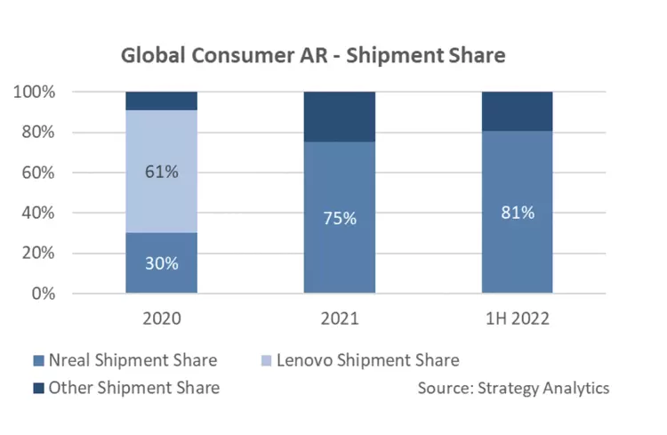 根据国际知名市场研究机构Strategy Analytics最新报告,2021年Nreal在消费级AR市场份额达到了75%,2022年上半年这一数据升至81%,在全球占据领先地位。