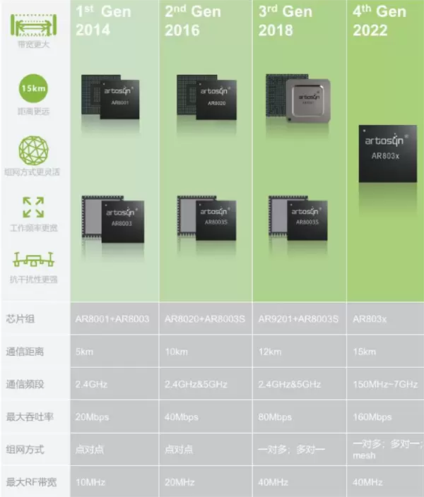 目前,酷芯无线传输芯片已历经一代AR8001+AR8003、二代AR8020+AR8003S、三代AR9201+AR8003S,并将于今年推出第四代全频段无线宽带2*2MIMO收发芯片。随着技术不断迭代,酷芯无线传输芯片从带宽、距离、私有协议组网方式、工作频率和抗干扰性上不断突破,预计第四代产品将快速覆盖更复杂的大型通讯网络建设。