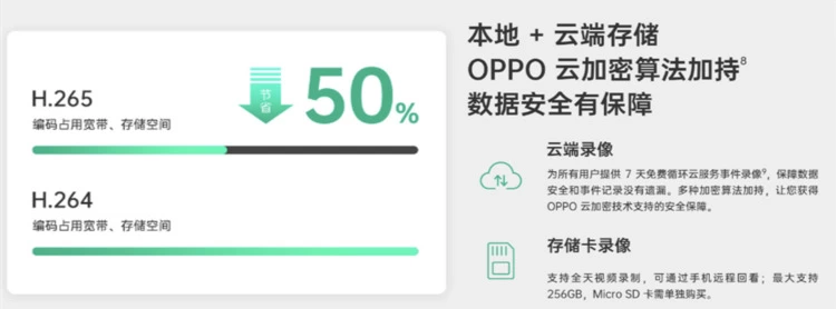 相比于传统摄像头的单存储模式,OPPO智美生活小豚当家智能摄像头2.5K云台版具备云端存储、本地Micro SD卡自动循环记录双存储模式,保证数据双重备份。MicroSD卡最大支持高达256GB,录满会自动循环录制,用最新的录像,覆盖最早的录像。同时,还为所有的用户提供7天循环云服务事件录像,保障数据安全。支持新一代H.265监控智能编码,在图像质量保持的情况下,有效节省空间,真正做到拍多少存多少,不用担心存储空间不够。