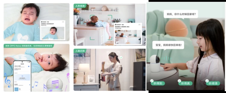 AI智慧安防能力方面, OPPO智美生活小豚当家智能摄像头2.5K云台版拥有出色的性能配置,内置强劲AI算力,可准确侦测人形,有效减少因行走或光线变化造成的误报警,精准识别人脸并推送消息,自动追踪。摄像头预置了AI哭声检测,通过运行哭声监测算法,依据特定声音频谱识宝宝哭声,并自动播放音乐,安抚宝宝,解放妈妈双手,缓解妈妈焦虑。一键呼叫功能,彻底解决旧摄像机只能单方呼叫的难题,轻按摄像机身上的通话键,可以向手机端发起语音通话邀请,实现双向语音、单向视频聊天,老人和孩子都轻松上手。
