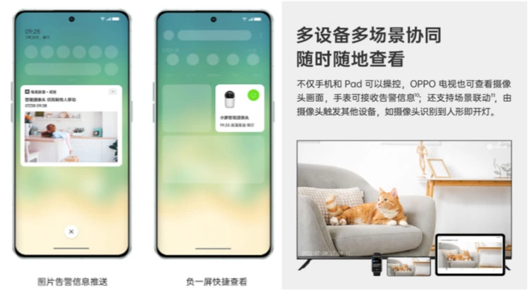 从软件到硬件,OPPO智美生活生态产品始终重视用户体验。小豚当家智能摄像头2.5K云台版能够与OPPO智美生活生态产品进行场景联动。不仅手机和Pad可以操控,OPPO电视也可以查看摄像头画面,手表可以接收告警信息。还支持场景智慧联动,比如摄像头识别到人形即开灯,带有图片的告警信息可推送至手机并直接显示,无需打开App,也可以通过小布助手语音打开或关闭摄像头等。