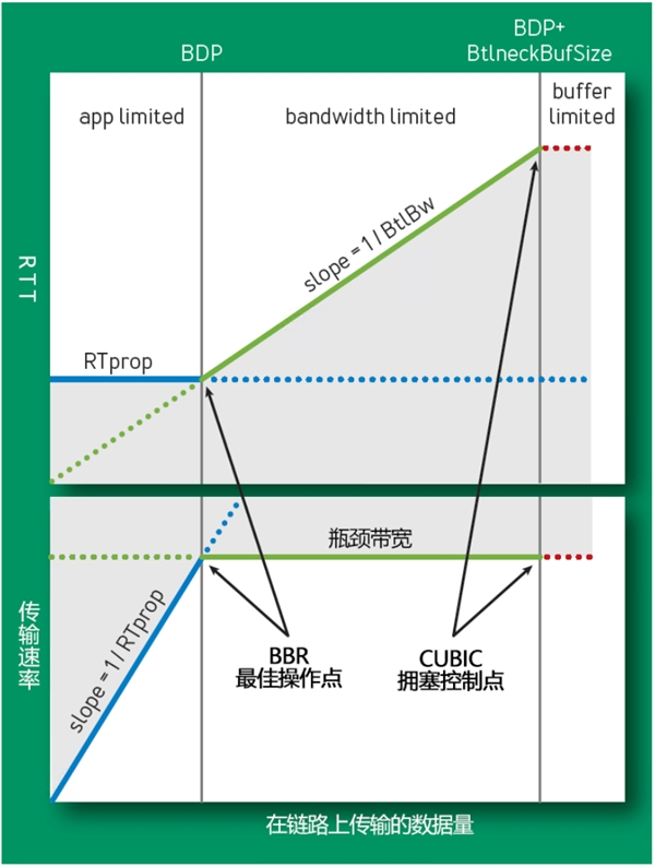 Cubic在拥塞避免阶段会逐渐加大发送窗口直至填满瓶颈队列,这种机制加速了拥塞的形成,造成了网络延时的波动。在链路瓶颈处保持最大带宽和最小延时的状态是拥塞控制的目标,但明显Cubic在目前的互联网环境中已经不能很好的胜任。谷歌提出一种基于延时带宽积的算法BBR (Bottleneck Bandwidth and RTT),使用了交替测试链路的最大带宽与最小的RTT的方法,来寻找名为Kleinrock的最佳操作点,这个点,核心特征是报文开始排队。如下图所示,Cubic的拥塞控制点是排队并且缓存已经满了。