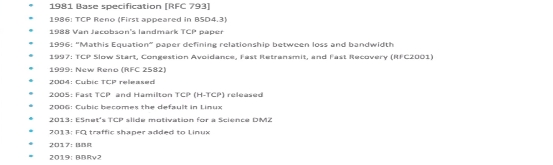 1980年代的互联网崩溃,促成了TCP拥塞控制的落地。经过十多年的发展,Cubic出现并延续至令,目前它仍然是互联网主流的拥塞控制算法,它基于著名的“加性增,乘性减”(AIMD)控制律,将丢包作为网络链路拥塞的指示。它会检测丢包,发现时便会主动降低发送频率,减少拥塞。这被称为“基于丢包”的拥塞控制算法。同类算法有几个,像更早前的Reno, BIC等。