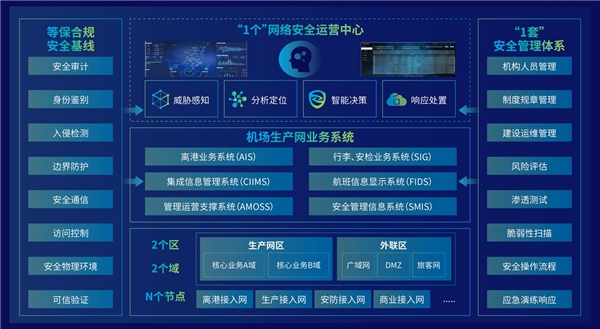整套安全框架围绕新一代安全运营中心,整合机场外联区、内联区(A域、B域)、离港、安防、综合接入网等边界安全能力,保障以“数据”资产为核心的数字化安全,解决终端、网络、云平台、大数据、工控系统等安全建设割裂的问题,形成集中决策、分布式协同的网络安全实战对抗能力。