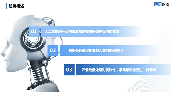 当下,人工智能产业逐渐迈入成熟化发展的新阶段,部分通用化、浅层化的人工智能产品和服务将难以较好地满足各行业日益垂直化、专业化、场景化、细分化的赋能需求。云测数据总经理贾宇航指出,当前AI数据发展有“人工智能进一步推进发展需要数据处理标准的收敛,数据处理流程逐渐融入业务处理流程,产业数据处理对实效性、准确率安全性进一步要求”三大发展趋势。这三大发展趋势将促进AI数据向高质、高效发展,持续优化AI产品和服务,以加速AI技术的商业化应用,从而服务于人类的生活。