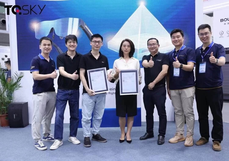 电博会第一天下午,国际独立第三方检测、检验和认证机构德国TÜV莱茵举办了颁证仪式,向天趣星空科技颁发视听眼镜低蓝光和无频闪认证证书,TQSKY T1是全球首个获得该项认证的视听眼镜。天趣星空创始人兼CEO王洁(中间)、TÜV莱茵大中华区电子电气产品服务区域总经理陈文华(右三)等双方代表出席了颁证仪式。
