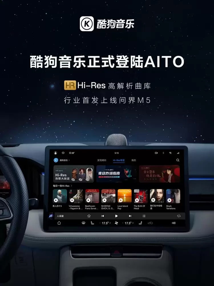 随后在今年4月,在与AITO汽车的合作中,酷狗音乐车载版又首次在车载行业内推出在线Hi-Res曲库。