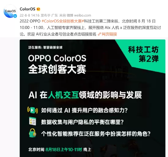 2022 OPPO ColorOS 全球创客大赛’正在火热进行当中,在泛在服务:智慧链接全球’的主题下,希望赋能全球科技爱好者,为全球创客选手搭建起创新科技的交流和协作平台。在全球数字化浪潮中,ColorOS也将继续与广大开发者和合作伙伴一起,通过科技的持续创新和开放,全面推动‘泛在服务’体验升级,开创智慧新生活。