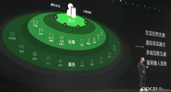 简单来说,泛在服务能够通过多设备的硬件传感器,对人、物、设备、环境等多元化信息进行融合感知获取相关数据,结合AI算法,可以在端侧对数据进行建模和推理,让终端能够在不同场景下推荐相应服务,打造出千人千面的使用体验。例如,人从家里出来进入车里,汽车与手机自动无感连接,车内音响自动播放你爱听的音乐,车内导航自动规划去公司最快捷的路线,到达公司停车位,音响自动关闭,走出汽车,汽车自动锁定等等。在泛在服务所构建的智慧生态中,各种智能设备不再各自为战,而是可以通过数据共享为用户提供无缝无感的使用体验,真正做到了让智能设备以用户为中心提供服务。