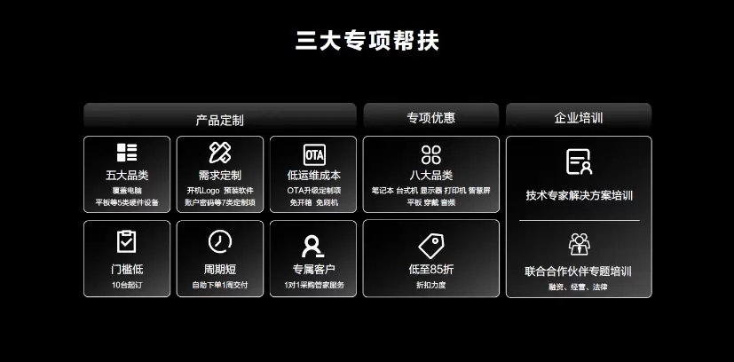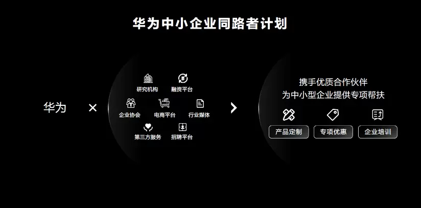 作为“同路者”,华为将从中小企业面临的困境出发,计划从产品定制、专项优惠、企业培训三方面助力中小企业成长。产品定制是指华为可根据中小企业经营场景为其提供定制化方案,助力提质增效,解决其设备力、生产力不足的难题;专项优惠方面,华为将在笔记本、台式机、平板等8大类产品上给予面向中小企业的专享折扣,真正做到为中小企业降低运营成本;授人以鱼不如授人以渔,除却设备和优惠上的支持之外,要想帮助中小企业更好地发展,突破业务经营瓶颈,就应该扎实人才培养,对此华为将联合合作伙伴在多方面对中小企业进行专题培训,并安排技术专家对有需要的企业针对实际业务场景进行解决方案培训。