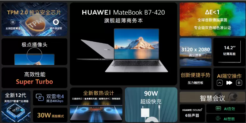 全新轻薄商务旗舰MateBook B7-420,带来简约的金属轻薄机身设计。3.1K高分辨率原色全面屏,P3及sRGB双色域达到平均ΔE<1实现高色准显示,造就非凡的屏幕效果和体验。搭载 12 代酷睿™处理器,获英特尔® Evo™认证,高能模式可达30W。得益于HUAWEI SOUND 六扬声器、四麦克风系统,以及全新AI慧眼、AI音效两大功能特性,能够让远程会议也仿佛面对面交流,为用户带来专业级的会议终端体验。搭配全区域感知压力触控板, 8种创新操作手势,没有鼠标也能轻松操控。