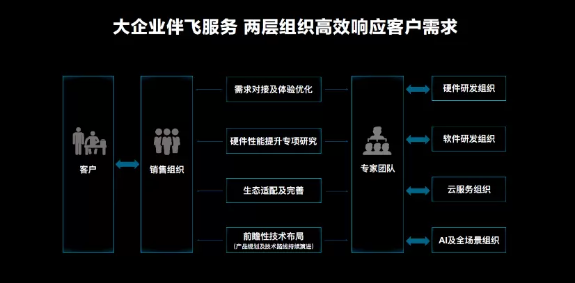基于华为软硬件生态和服务体系,华为终端为大企业提供伴飞服务,用两层组织来高效响应客户的需求。销售组织对接客户的需求,对客户的硬件、软件、生态进行一系列的分析,找出客户真正需求的痛点;专家团队对接软件、硬件、云服务、AI及全场景四个组织,基于客户需求提供咨询服务和系统分析,提供可靠的解决方案。