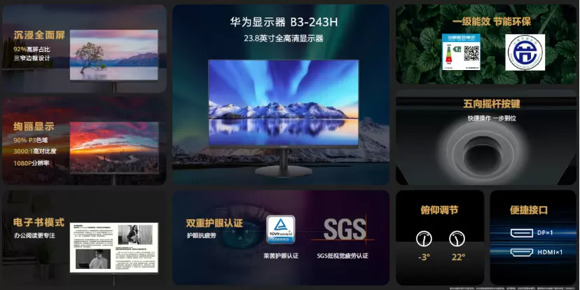 华为显示器B3-243H配备23.8英寸高清护眼屏,画面细腻跃然眼前,目光所及皆是鲜活佳境,无论播放高清图片,还是使用各种办公软件,响应快速,画面生动逼真;另显示器获得德国莱茵 TÜV低蓝光、无频闪双重认证,能缓解长时间看屏幕带来的眼睛不适;同时边框采用三微边框设计,成就高达92% 的屏占比,令办公视野更为广阔;此外精巧的外观设计,纤薄的机身,整体商务简约,不论是搭配笔记本还是台式机使用,都能助力大幅提升办公效率。