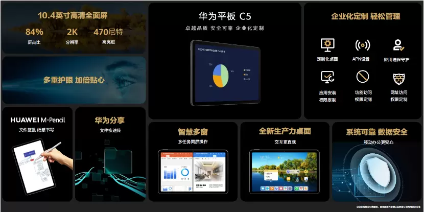 其中华为平板 C5瞄准企业办公市场,搭载平行视界、华为分享等系统级功能,为办公交互、传输提供更加便捷高效的解决方案;支持丰富的移动设备管理扩展能力,满足政企客户移动办公、安全管理需求。华为平板 C5搭载了HarmonyOS 2,通过多项内核优化,带来流畅的使用体验。华为平板 C5搭配一块10.4英寸的2K全面屏,屏占比高达84%,呈现全视屏效果,用理性美感注入浓厚商务气息。