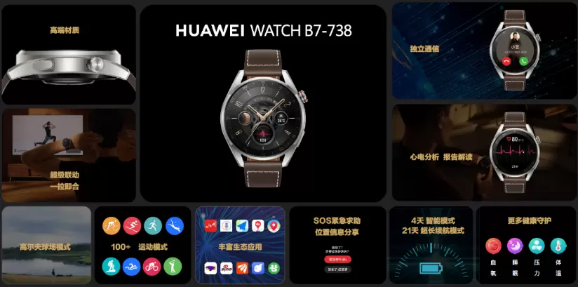 智能穿戴设备是可以贴近人体使用的电子产品,有基础成为更懂人的身体、需求的产品,凡事腕上解决。在万物互联的时代,智能手表必然会成为其中一个交互中心,打造极具未来感的操控体验。相比于其他系列的华为手表,HUAWEI WATCH B7-738具备eSIM独立联网功能,搭载Harmony OS 3手表系统,更独立更智慧,还可定制外观、平台对接、数据开放、应用场景等层面进行创新,为企业赋能。