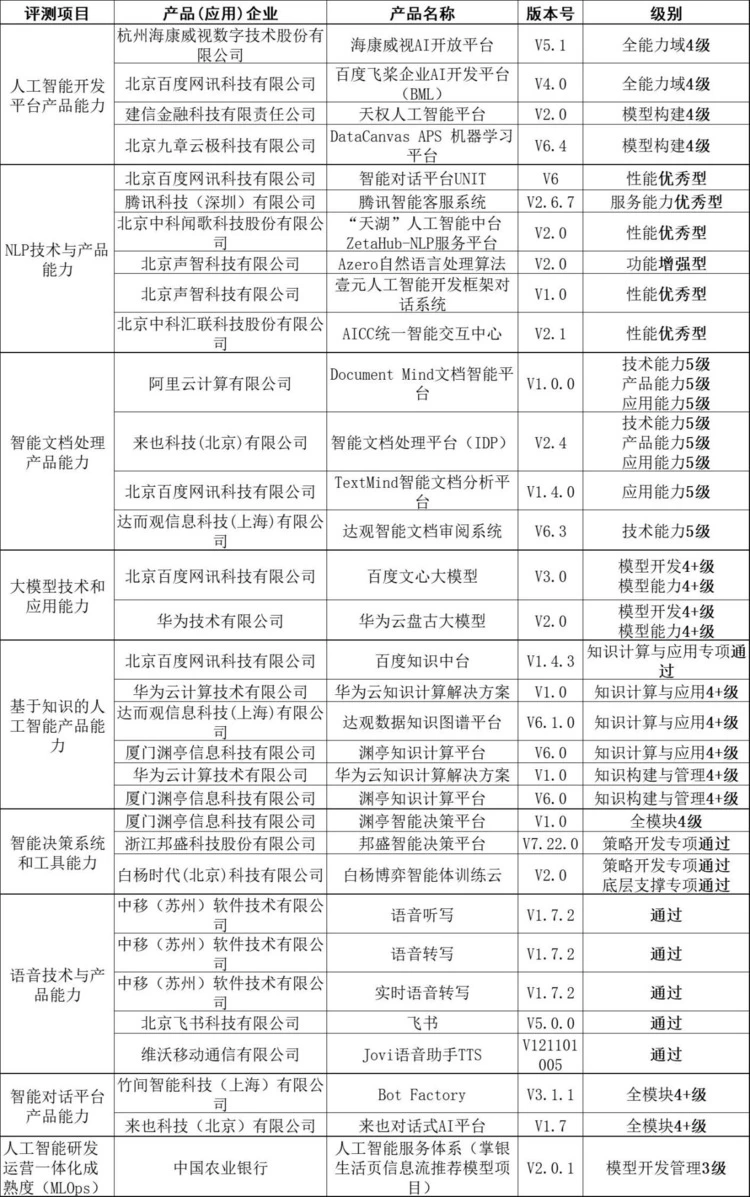 2022年第六批可信“AI”评测共有33款产品(应用)通过了评测,企业和产品清单如下: