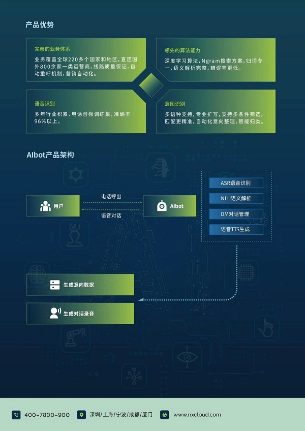 3、产能上的爆发式提升,相比人工,牛信云智能语音机器人不需要考虑薪资、招聘、培训、场地、以及担心人员流失的问题,同时可以很灵活地调节产能,对于出海企业来讲,是一个非常简单的配置的行为,可扩张可收缩,能不断智能学习,代替无效人工;基于牛信云全球布局云厂商的能力,出海企业在扩容的时候成本是非常低的,理论上可以达到无限的扩容能力;4、在客户管理上,相比传统外呼的统计难,海量线索难以跟进,转化难控等痛点,牛信云智能语音机器人通过SaaS平台进行数据沉淀,让运营管理更有据可依。除了直观展现效果的意向结果,通过各类数据与意向关联,实时标记高意向人群,便于人工快速跟进,同时在任务进行过程中,有任何问题也会同步发送至人员手里,让任务的进行更加顺畅。