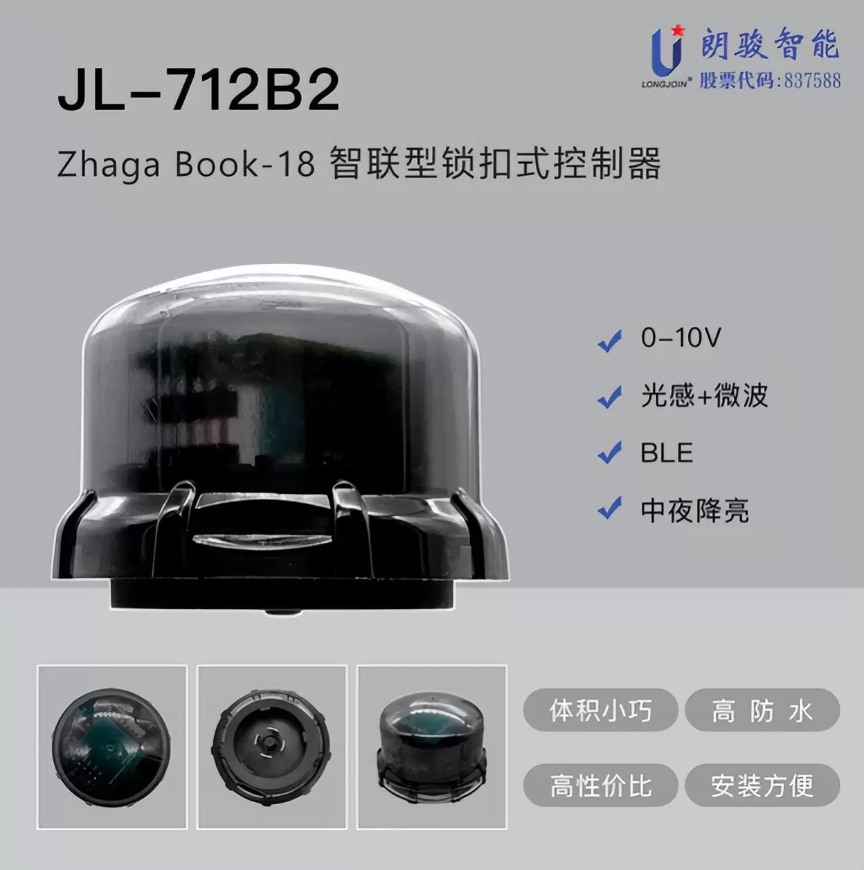 朱祥辉:第一款是JL-712B2 Zhaga Book-18 智联型锁扣式控制器,这款是近距离蓝牙通信方式的产品,它适用于园区、校舍、仓库、停车场,它本身也很小,体积50×36,可使用我司“掌上灯控”app进行远程控制和管理。