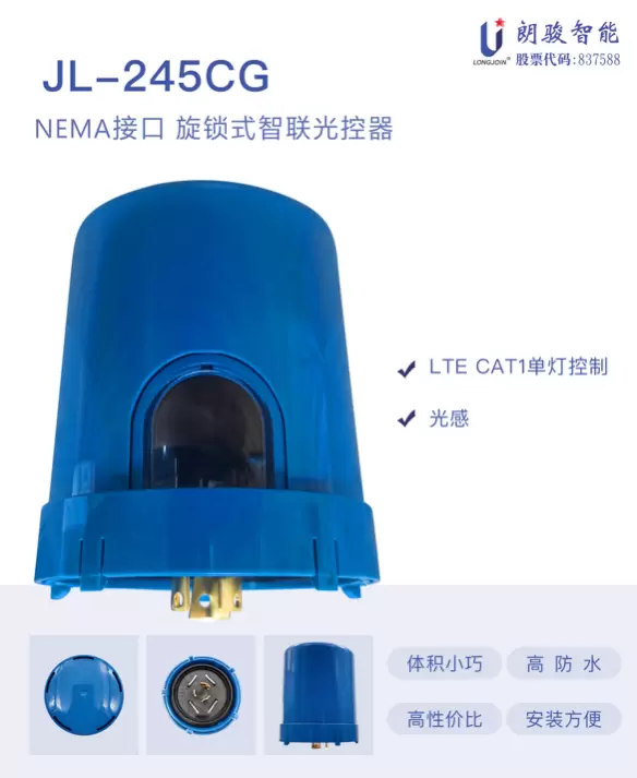 第二款是JL-245CG NEMA接口旋锁式智联光控器,这款是LTE CAT1通信方式的产品,它可以接入我们的智慧灯杆系统UM9900,适用于路灯等户外照明场景,每一个产品上面都需要插一个物联网卡。
