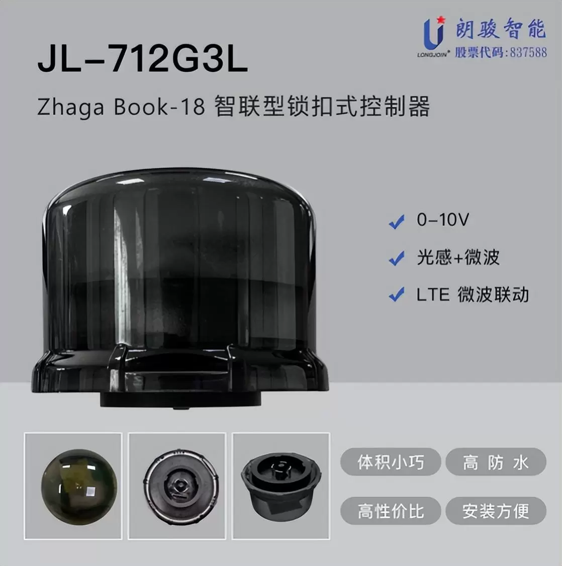 第三款是JL-712G3L Zhaga Book-18 智联型锁扣式控制器,这是我们今年重点开发的一款产品,它通信用到了LTE CAT1和Sub-G ,传感器方面有光感、微波,我们想实现「微波联动」的功能,行话里把它叫做「预亮式」,人或车经过某个灯杆,我们会根据行进路径把前方的道路预先点亮5-10盏,点亮方式可以通过平台自定义。