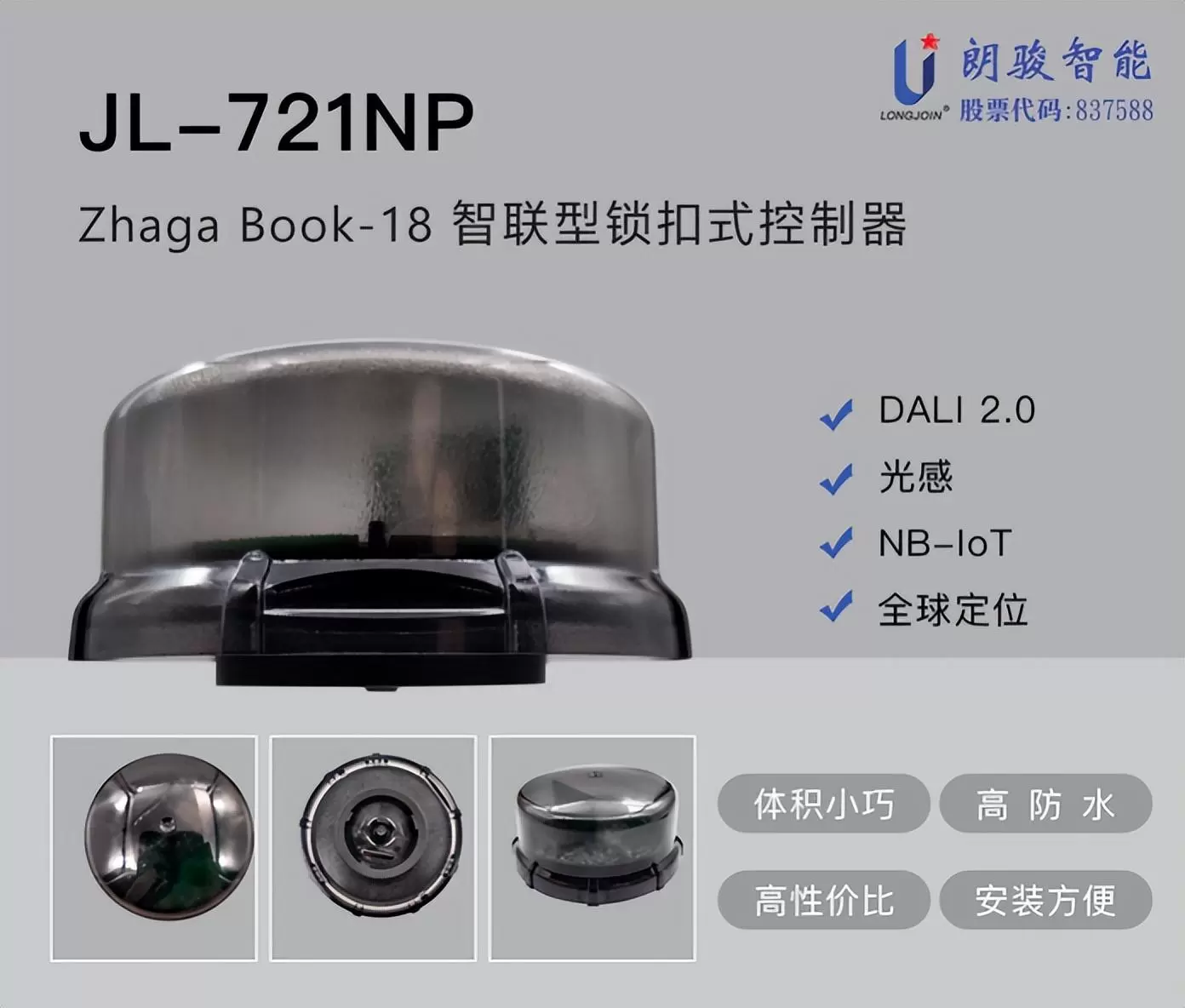 第四款是JL-721NP Zhaga Book-18 智联型锁扣式控制器,它的通信方式是NB-IoT(窄带物联网),支持全球频段,基本包含了全球主要城市的一些基站频段。额外我们还附加了GPS、北斗功能,这是国外客户的特别需求。