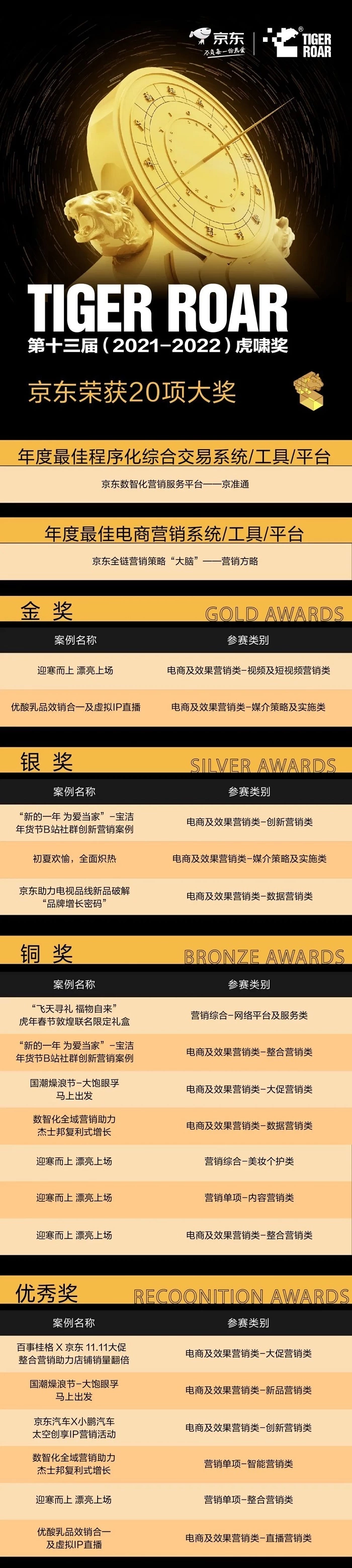 京东凭借数智化营销实力,一举揽获本届虎啸奖2金、3银、7铜、6优秀及2个年度最佳平台奖,共计20项大奖。其中案例《迎寒而上 漂亮上场》荣获电商及效果营销类-视频及短视频营销类金奖,案例《优酸乳品效销合一及虚拟IP直播》荣获电商及效果营销类-媒介策略及实施类金奖。