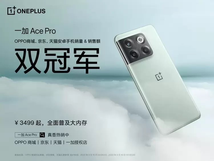 一加 Ace Pro兼具极致性能与全面体验,深受用户青睐。首销当天斩获全网销售1秒破亿的亮眼成绩,还取得了OPPO商城、京东、天猫安卓手机销量和销售额双冠军的战绩。一加 Ace Pro正在火爆热销中,一加 Ace Pro 12GB+256GB版本,售价3499元;一加 Ace Pro 16GB+256GB版本,售价3799元;一加 Ace Pro 16GB+512GB版本,售价4299元。用户可在 OPPO 商城、京东、天猫、一加授权门店等渠道进行购买。