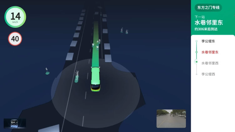 随着车门关闭,自动驾驶巴士自行启动并开始按照规划线路行驶,方向盘全程自动调整方向。仅有一名安全员全程监督保证车辆行驶安全。据了解,自动驾驶巴士目前行驶的线路为东方之门专线,沿途共有李公堤东、水巷邻里东、水巷邻里西、李公堤西等5站,全程行驶路线形成闭环,合计用时20分钟左右。在乘客区的左前方,一块硕大的智能驾驶显示屏幕以3D渲染技术清晰地展示出巴士目前的运行轨迹以及它所“看到”的周围所有物体。无论是正在修建的路面、穿越斑马线的行人,还是左侧超车行驶的轿车,自动驾驶巴士都清晰无误地识别并反馈到了显示屏幕上。