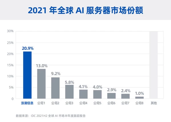 近日,国际数据公司IDC发布2021H2《全球人工智能市场半年度追踪报告》(《Worldwide Semiannual Artificial Intelligence Tracker》)。报告显示,2021全年,全球人工智能服务器市场规模达156亿美元,约合人民币1006亿元,浪潮信息市场占有率达20.9%,份额同比提升3.6%,销售额同比增长68.3%,继续保持全球市场第一。