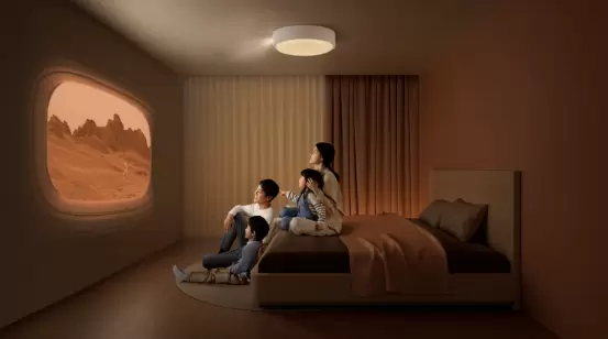 实际上,极米神灯占据卧室天花板中心位置带来的优势,可不止在于360度环绕声场这一点。因为其作为吸顶灯的设计形态,极米神灯将投影藏入卧室本就存在的照明当中,不仅在视觉上做到了“无存在感”,更是在空间上实现了“真的不占地”;也是因为其作为吸顶灯的高度和投影角度,极米神灯首次从物理空间设计上避免了射眼的风险,也打破了传统投影在家中制造出来的禁区,让每一位家人都能安心、自由地在卧室中穿行。