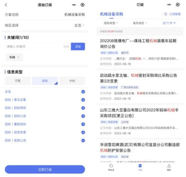 其次,百度番番寻标宝提供订阅服务,通过系统主动为用户推送订阅标讯,将传统的"人找标"模式转变为"标找人",让"坐等商机"成为现实。