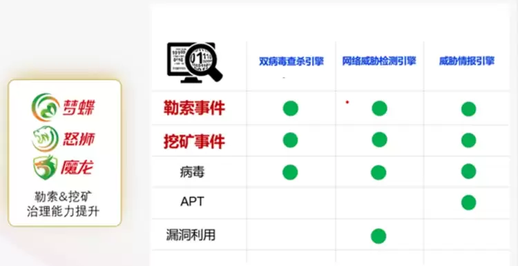 在勒索与挖矿治理的方案中,亚信安全的“梦蝶+怒狮+魔龙”三大引擎将起到重要作用: