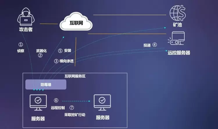 挖矿威胁攻击链:攻击者首先搜寻目标的弱点,然后使用漏洞和后门制作可以发送的武器载体,并将武器包投递到目标机器,在受害者的系统上运行利用代码,并在目标位置安装恶意软件,为攻击者建立可远程控制目标系统的路径,最后释放挖矿程序,执行挖矿,攻击者远程完成其预期目标。信舷防毒墙部署在用户网络边界,针对挖矿威胁攻击链网络侧行为,实现全阶段检测防护。