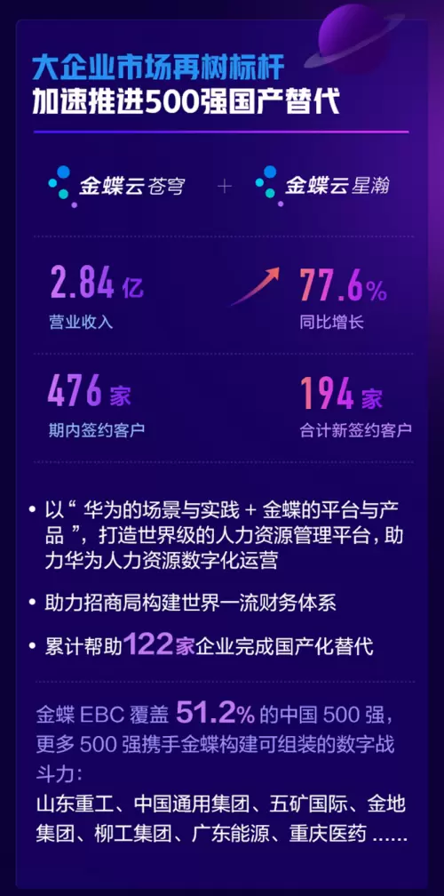 根据金蝶提供的数据,金蝶EBC已经覆盖过半的中国500强企业,累计帮助122家企业完成国产化替代,为华为、万科、招商局、物产中大、河钢集团等众多世界500强进行数字化管理重构。