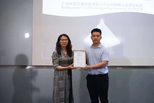 2022年8月23日,德国莱茵TUV大中华区(以下简称"TUV莱茵")向广东辉煌环保科技有限公司(以下简称"辉煌环保")涂层纸产品颁发可生物降解认证证书。辉煌环保董事长林光,TUV莱茵广东公司执行董事姜宏女士出席了颁证仪式。