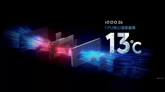 为获得更好的功耗表现,iQOO Z6搭载六重冰封液冷散热,由10705.2mm2高导合金主板上层、1550mm2 VC液冷均热板、22873mm2大面积石墨散热膜、1089mm2散热铜箔、高导热凝胶以及6颗温度传感器组成,强悍散热表现充分压制发热源,CPU核心温度直降13℃。