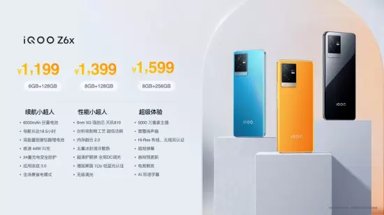 iQOO Z6 共有3个版本可供选择:8+128版本售价1699元,8+256版本售价1899元,12+256版本售价2099元;iQOO Z6x共有3个版本可供选择:6+128版本售价1199元,8+128版本售价1399元,8+256版本售价1599元。
