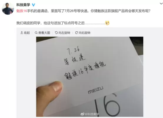 今天上午,魅族就给一众媒体发放了一张手写“7.26等快递 魅族16年度旗舰”的卡片,连续两天让大家等快递的操作有点让人摸不着头脑,不过不少KOL都认为,7月26日,魅族将“正儿八经地”向媒体发放邀请函,还要宣布新机发布时间了,魅族16很可能会在下月初正式发布。