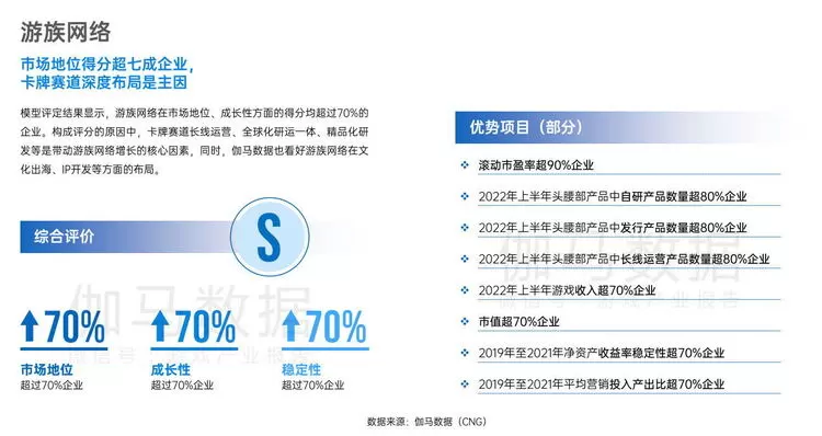 根据《2022年上市游戏企业竞争力报告》统计结果显示,截止2022年6月30日,国内涉及游戏的上市企业数量共197家,贡献的游戏产业市场份额却超过75%,因此现阶段上市游戏企业依然主导产业发展。而在企业竞争力的评估上,伽马数据从市场地位、成长性、稳定性三方面建模,其中市场地位主要衡量现有成果及资源积累,成长性主要衡量预期发展速度,稳定性主要衡量风险抵抗能力。模型评定结果显示,游族网络在市场地位、成长性、稳定性等方面的得分均超过70%的企业。构成评分的原因中,卡牌赛道长线运营、全球化研运一体、精品化研发等是带动游族网络增长的核心因素,同时,伽马数据也看好游族网络在文化出海、IP开发等方面的布局。